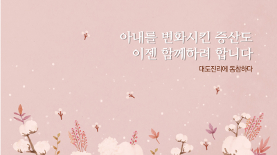 그러던 아내가 정말 어디를 믿고 다닌다고 말을 하였습니다. 일주일 중 수요일 저녁, 일요일 아침에 증산도 도장에 다닌다는 것입니다. 저는 기독교, 불교는 들어 봤어도 증산도는 처음이었습니다. 그래서 뭐 하는 곳이냐고 물었더니 아내는 상제님을 모시고 조상님을 모시는 곳이라고 하였습니다. 증산도가 생소하였던 저는 요즘 세상이 하도 뒤숭숭하니 걱정 반으로 너무 빠지지는 말고 취미 생활로만 다니라고 하였습니다.