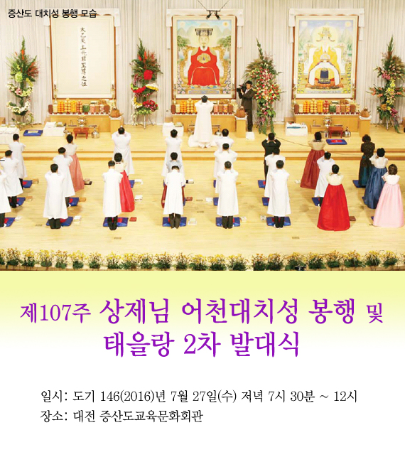 제115주 천지성부 삼신일체 증산 무극상제님 어천대천제 봉행증산도 교육문화회관 태을궁에서 오는 7월 29일(음력 6월 24일) 제 115주 천지성부 삼신일체 증산 무극상제님 어천(御天) 대천제가&...