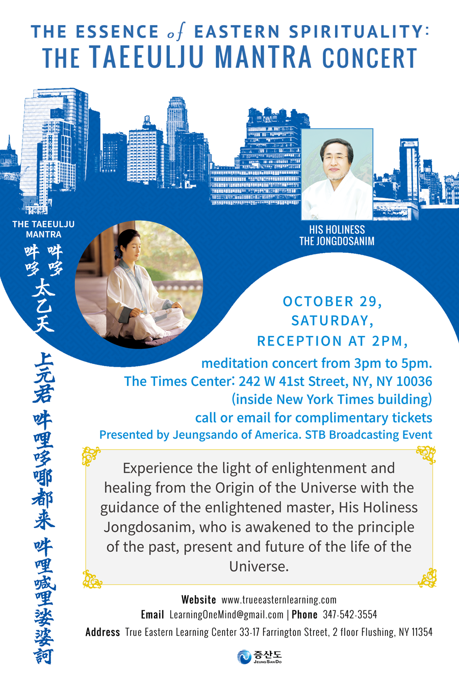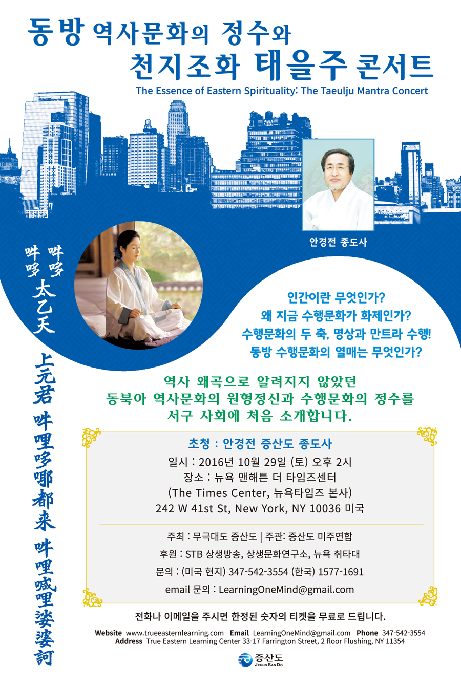 증산도 미주지역연합의 주관으로 증산도의 안경전(安耕田) 종도사(宗道師)를 강사로 초청해 여는 이번 행사의 공식 타이틀은 ‘동방 역사문화의 정수와 천지조화 태을주 콘서트’(The Essence of Eastern Spirituality: The Taeeulju Mantra Concert).