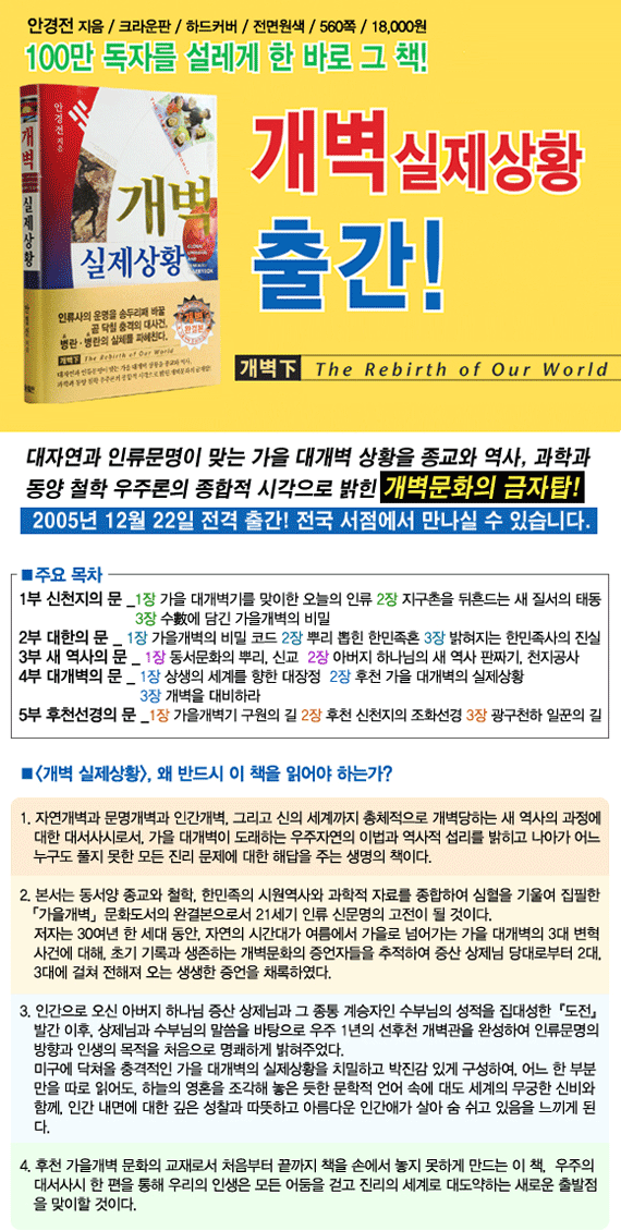 독후감 공모대회 성황리에 개최 중 지난 2월부터 전국적으로『개벽 실제상황』독후감 공모대회가 열리고 있다. 동서고금을 아우르는 문화의 결정체가 집약된 이 책을 읽고 감동을 전하는 사연이 늘고 있고, 또...