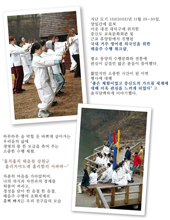 ♣ 道紀 133(2003)년 12월 5~6일 양일간, 증산도 로스엔젤레스(LA) 도장의 주최로 베버리힐즈 스카이 태권도장(관장 김도연 포감, LA도장)에서 열린 태을주 수행 워크샵.