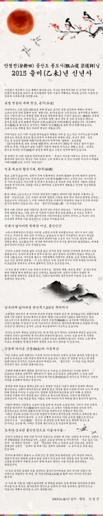 안경전(安耕田) 증산도 종도사(甑山道 宗道師) 2015 을미(乙未)년 신년사새해가 밝아옵니다.또다시 희망찬 내일을 그려보지만 눈앞의 현실은 팍팍하기만 합니다. 천지와 대자연이 병들어 그 안에 깃든 뭇 생명...