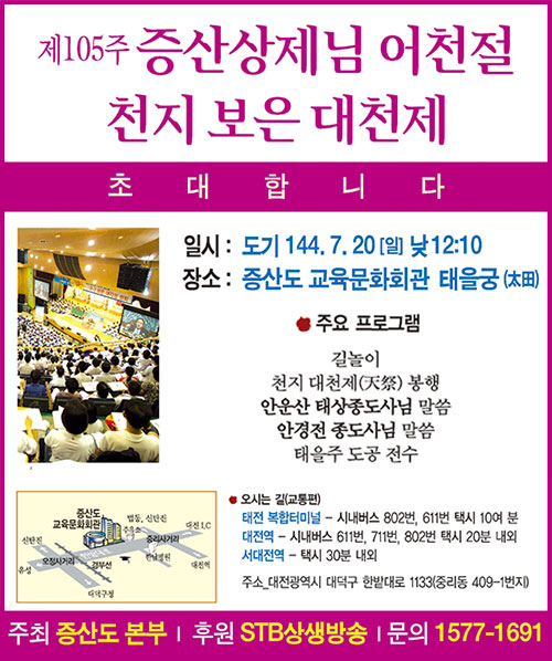 2014년 7월 20일(음력 6.24) 대우주 통치자 하느님이신 증산상제님의 105주기 어천절 대천제에 초대합니다. 천제는 일찍이 대한민국 시원역사 시대인 환국-배달-조선 이래로 우리 민족이 한마음이 되어상...