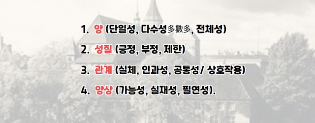 이에 따르면 인간의 오성에는 12개의 “범주들”이 있다. 범주들, 곧 근본개념들은 “맹목적인”, 당장은 무의미한 직관 질료들을 정리하여 밝게 드러나게 한다. 범주들 또는 사유의 근본형식들로는 다음과 같은 것들이 있다.