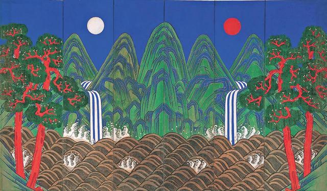 조선 시대에 왕이 나와서 조회朝會를 하던 궁궐의 정전正殿에는 공통으로 배치된 것이 있었습니다. 임금이 앉는 어좌御座의 뒤편에 놓인 병풍屛風입니다. 다섯 개의 산봉우리와 해, 달, 소나무, 폭포, 그리고 파도가 출렁이는 바다를 그린 것으로 일월오봉도日月五峰圖·일월오악도日月五岳圖·일월곤륜도日月崑崙圖’라고 부릅니다.