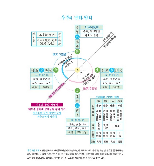 상제님의 우주 통치 법도, ‘생장염장生長斂藏’! 이것이 바로 인류가 그토록 찾아 왔던 진리입니다. 하지만 이 말씀을 통해서 바로 진리의 실상을 밝혀내기는 어렵습니다. 그러므로 진리를 탐구할 구체적인 방법이 필요합니다. 그것이 바로 음양오행의 법칙입니다. 구체적으로는 하도河圖·낙서洛書와 이를 바탕으로 한 팔괘八卦·오운육기五運六氣 등입니다.