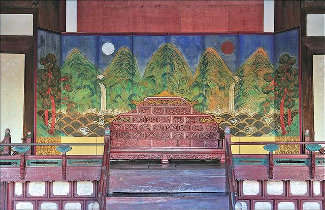 일월오봉도는 중국이나 일본에서는 발견되지 않고 오직 조선에서만 발견됩니다. 현재는 경복궁의 근정전勤政殿, 창덕궁의 인정전仁政殿, 창경궁의 명정전明政殿, 덕수궁의 중화전中和殿에 배설排設되어 있습니다.
