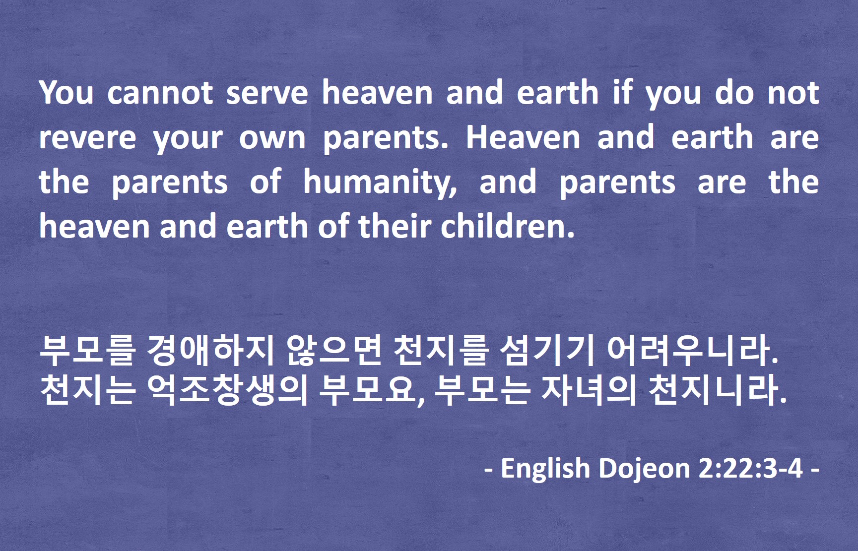You cannot serve heaven and earth if you do not revere your own parents. Heaven and earth are the parents of humanity, and parents are the heaven and earth of their children.
