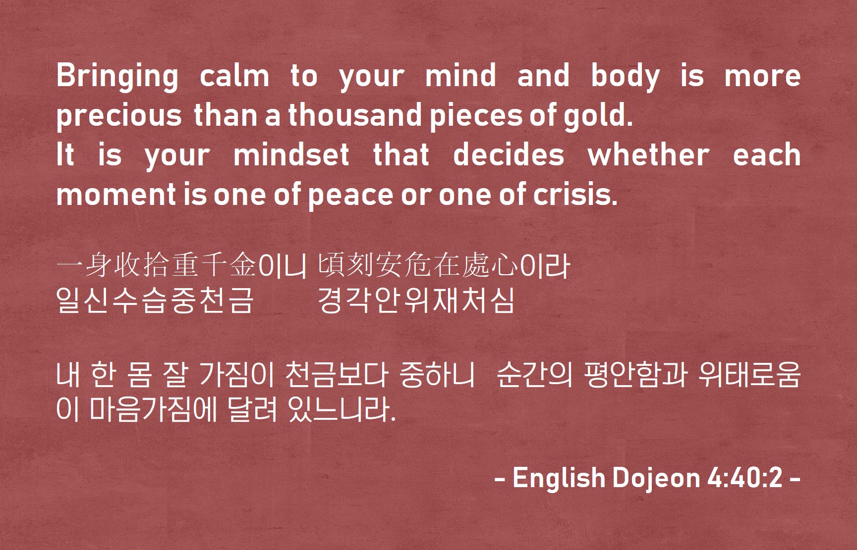 내 한 몸 잘 가짐이 천금보다 중하니 순간의 평안함과 위태로움이 마음가짐에 달려 있느니라.