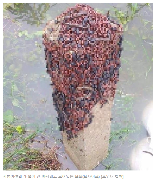 지렁이·벌레가 물에 안 빠지려고 모여있는 모습(모자이크) [트위터 캡처]