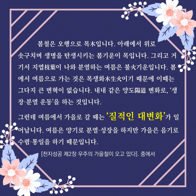 나 같은 사람은 평생을 교육에 몸담고 살았다. 교육은 평생에 걸친 문제이면서 인간을 깨닫고 느끼면서 자연스럽게 체험하는 것이라고 믿는다. ‘사랑이 있는 교육이 세상을 바꾼다’라는 내 주장과 신념도 그렇다.