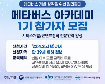 한국전파진흥협회에서 메타버스 아카데미 1기 교육생을 모집합니다. 관심있는 분은 신청해보세요!주최 | 과학기술정보통신부주관 | 정보통신산업진흥원 | 한국전파진흥협회 | METAVERSE ACADEMY교육인원&n...