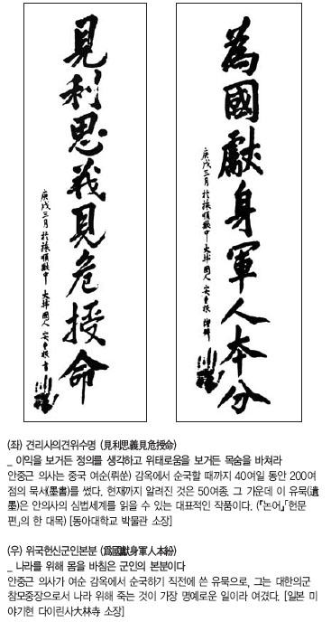 이처럼 타고난 무인 기질을 가지고 있었음에도 불구하고, 옥중(獄中)에서 그가 지었던『동양평화론』에선당대 국제정세와 미래상에 관해 탄복할 만큼의 해박한 역사적 식견과 인류애를 품은 성인(聖人)과 같은 인품마저 엿보인다. 또 그가 지은‘애국적 한시’(漢詩)에는 뛰어난 선비의 기풍이 보인다. 그는 당대에 보기 드문 문무(文武), 성웅(聖雄)의 덕성을 함께 지닌 인물이었던 것이다.