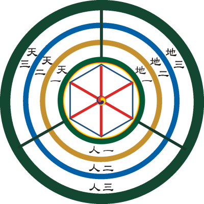 -천부경의 중심을 이루는 칠점육각(七點六角)-천부경 81자의 중심에는 숫자 6이 있다. 6은 음양오행에서 자궁수(子宮水)와 같으니, 6이 있는 곳은 생명의 근원이 됨을 말한다. 천부경에서의 일시무시일과 일종무종일...
